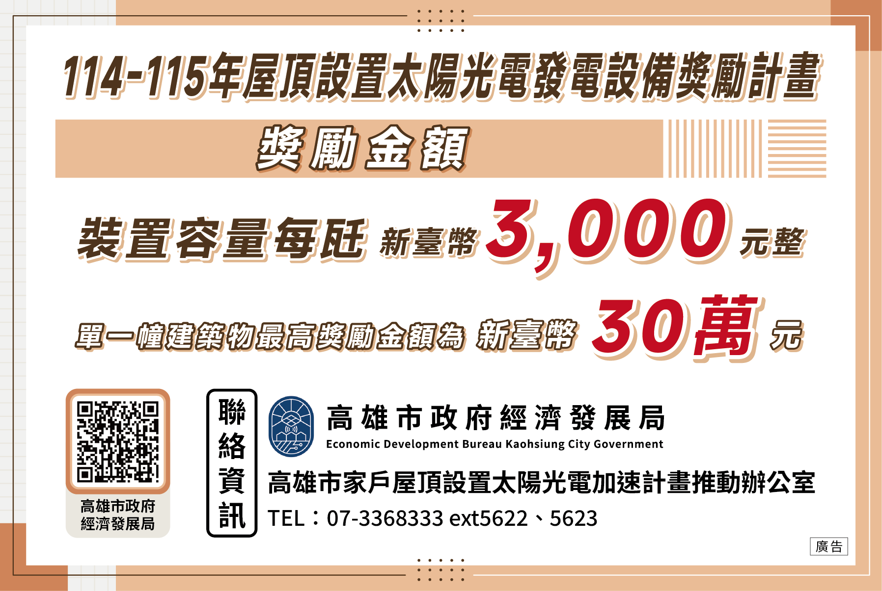 高雄市政府經濟發展局 公告 發文日期:中華民國114年12月8日 發文字號:高市經發公字第11436998600號 附件:114-115年屋頂設置太陽光電發電設備獎勵計畫申請文件1份 主旨:公告「114...